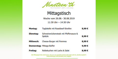 Der Mittagstisch beim Nineteen'th bietet euch täglich wechselnde Gerichte zum Mittags-Sparpreis!