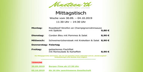 Der Mittagstisch beim Nineteen'th bietet euch täglich wechselnde Gerichte zum Mittags-Sparpreis!