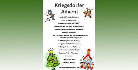 Am zweiten Adventssonntag lädt euch der Ortsring Kriegsdorf e.V. zum diesjährigen Kriegsdorfer Advent herzlich ein