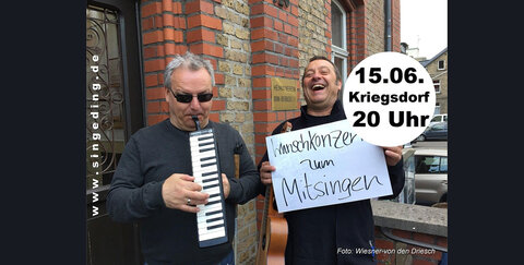 Gitarrist und Entertainer Filou und Keyboarder Matthias Klaus laden auch in diesem Jahr zum Mitsingkonzert ins Kriegsdorfer Pfarrheim. Mit ihrem erstaunlichen Repertoire aus mitsingtauglichen Liedern, Welthits und Evergreens aus unterschiedlichsten musikalischen Genres begeistern die Bonner Musiker immer wieder Menschen aller Generationen.