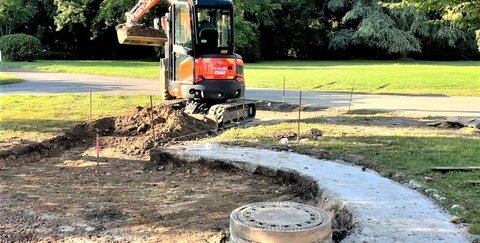 Eine ganz andere Aufgabe wird auf dem Parkfriedhof in Troisdorf-Eschmar erfüllt: Das Umweltamt hat Planung und Bau des neuen Grabfeldes für Urnenwände übernommen. Derzeit wird die Fläche hergerichtet. Es entstehen drei Halbkreise mit Stelen in 3er Gruppen, in denen jeweils vier Urnenkammern für eine Ruhezeit von 20 Jahren bereitgestellt werden. Der weitere Ausbau der Stelen kann zukünftig je nach Bedarf erfolgen. Die Maßnahme soll Ende September 2021 fertiggestellt sein.