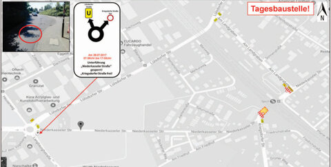 werden. Die Zufahrt zur Kriegsdorfer Straße bleibt frei. Von dort führt die Umleitung über die Niederkasseler Straße zum Kreisverkehr und weiter über Lülsdorfer Straße und Am Landgraben zur Niederkasseler Straße am Bleimopsplatz und umgekehrt. Die Stadt bittet um Verständnis für die eintägige Regelung und um besondere Rücksicht.