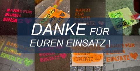 Botschaft „Danke für euren Einsatz!“ vor Krankenhäusern, Feuerwachen, Apotheken und