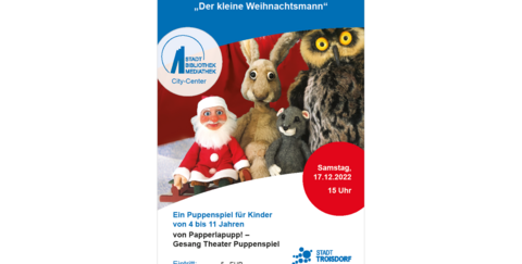Am 17.12.2022 ab 15 Uhr wird in der Stadtbibliothek in Troisdorf das Puppenspiel „Der kleine Weihnachtsmann“ für Kinder von vier bis elf Jahren aufgeführt.