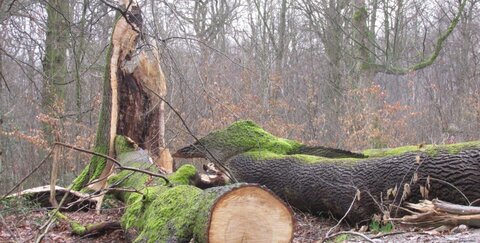 Der umgestürzte Baum soll in der Heide verbleiben. Liegendes und stehendes Totholz hat wichtige ökologische Funktionen und bietet vielerlei Arten Unterschlupf. Insbesondere im Naturschutzgebiet kann es daher sinnvoll sein, dass Totholz vor Ort belassen wird. Die Wege und die Eremitage wurden freigeschnitten.