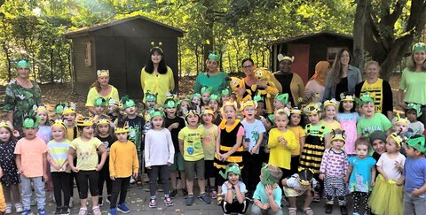 Alle verkleideten sich als Bienen oder Grashüpfer und flogen und hüpften durch den Garten der Kita. Ganz besonders freuten sich alle Kinder über den Besuch der „Biene Maja“ und ihres besten Freunds „Willi“. Mit Liedern und einem „Bienentanz“ überraschten die Kinder das Geburtstagskind. Die „Biene Maja“ war von der Aufführung so begeistert, dass sie allen Geburtstagsgästen ein leckeres Eis spendierte. Übrigens: Das Buch „Die Biene Maja und ihre Abenteuer“ von Waldemar Bonsels erschien bereits 1912. 1976 startete die ZDF-Zeichentrickserie.