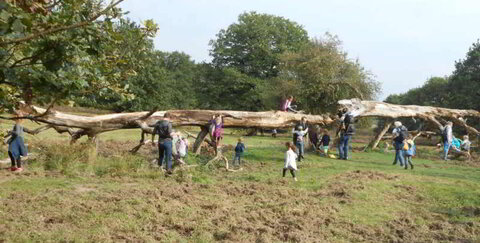 In diesem Jahr ging es bei schönem Wetter in die Wahner Heide. Unterwegs trafen die Wanderer auf Willi Wurm, der als Motto-Tier die Kinder durch die Wanderung und durch das Jahr begleiten wird. Aufregend wurde es, als ein hölzerner Drache auf dem Weg auftauchte. Schöner als jedes Klettergerüst stellte sich ein verwunschener Baum heraus, der die Kinder einlud, ihn zu besteigen.