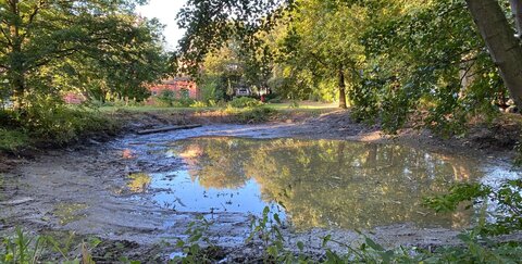 Nachdem in den beiden vergangenen Jahren bereits einige stehende Gewässer im Park an Haus Broich entschlammt wurden, hat sich das Umweltamt in diesem Jahr den Teich am Bürgerhaus vorgenommen.
