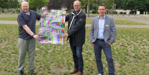 Das hochkarätige Programm stellten der zuständige Kulturdezernent, Beigeordneter Horst Wende, Frank Baquet vom Kunsthaus Troisdorf und Florian Sydow, Leiter der Stadthalle Troisdorf, auf dem Platz an der Stadthalle vor. „Als Abschluss findet am 31. August um 19.30 Uhr eine Jazzsession statt, wie sie im Kunsthaus schon zum festen Programm gehört“, erklärte Baquet. Zu den Konzerten kann man sich Sitzgelegenheiten wie Klappstühle mitbringen. Auf Abstand ist zu achten. Umsonst und draußen - viel Spaß bei TROPEN AIR 2020!