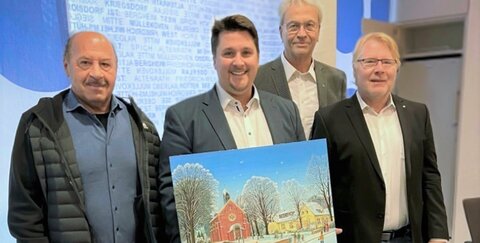 Die Kirche in Kriegsdorf mit einem Weihnachtsmarktstand im Vordergrund ist das Motiv des Adventskalenders, den der Lions Club Troisdorf auch in diesem Jahr wieder für einen guten Zweck herausgibt. Gemalt hat die winterliche Szene der Troisdorfer Künstler Josef Hawle.