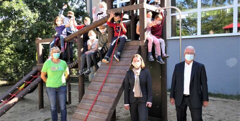 „Das vorherige Spielgerät war in die Jahre gekommen. Ersatz konnten wir schnell beschaffen und auch neuen Sand aufschütten, damit der Platz sicher ist und das Toben in den Pausen wieder Spaß macht“, erklärte Bürgermeister Jablonski. Die Stadt investierte 25.000 Euro für Anschaffung und Aufbau. Darum kümmerte sich das städtische Amt für Umwelt- und Klimaschutz. Der Bauhof kümmert sich um die Pflege der Anlage wie auf den 50 städtischen Spielplätzen auch.
