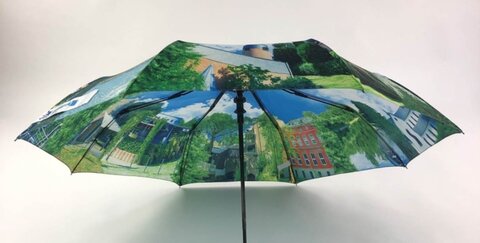 Bekannte Motive aus den Troisdorfer Stadtteilen schmücken den Schirm, den die städtische Pressestelle jetzt wieder im Angebot hat. Er war 2020 schnell ausverkauft. Bei Regen wie bei Sonnenschein bietet der farbenfrohe Schirm Schutz. Mit dem aufgedruckten Kranz beliebter Örtlichkeiten, die sich unter strahlend blauem Himmel ineinanderfügen, ist er dabei ein echter Hingucker und wird nicht nur heimatverbundene Troisdorferinnen und Troisdorfer begeistern.