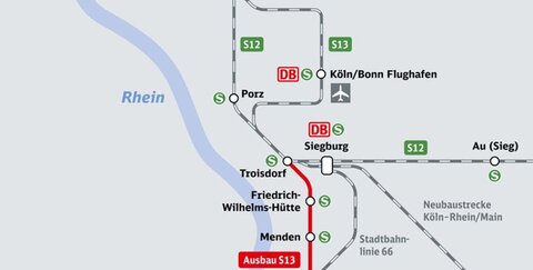 Mit dem Ausbau der S 13 von Troisdorf nach Bonn-Oberkassel werden in Zukunft auch die Stadt Bonn und der Rhein-Sieg-Kreis über das S-Bahn-Netz mit dem Flughafen Köln/Bonn verbunden. Die neue rund 13 Kilometer lange Strecke wird zu einer wesentlichen Verbesserung des öffentlichen Schienenpersonennahverkehrs beitragen und die Region Bonn besser an das S-Bahn-Netz des Ballungsgebietes Köln anbinden. Vier der bereits sechs vorhandenen Haltepunkte und Bahnhöfe werden modernisiert und barrierefrei gestaltet. Zusätzlich entstehen zwei neue Haltepunkte. Mehr Infos auf www.bauprojekte.deutschebahn.com/p/s13.