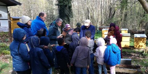 Ein Ausflug führte mit einem kleinen Waldspaziergang zum Troisdorfer Lehrbienenstand, wo Stefan Lehmann den Kindern, Eltern und Helfer*innen interessante Fakten über Bienen erzählte. So fanden es viele erstaunlich, dass die Bienen, die den Honig sammeln, nur etwa 30 Tage alt werden, oder dass Regentropfen Bienen erschlagen können und Bienen sich deswegen vor Regen verstecken.