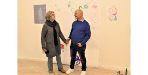 Das niederländische Künstlerpaar Regula Maria Muller und Moritz Ebinger hat zusammen ein Kunstwerk in der Stadtbibliothek kreiert, das die Wand am Eingang schmückt.