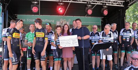 Am Ende waren es 5.750 Euro, die die Organisatoren der Vor-Tour der Hoffnung am Sonntag auf dem Fischerplatz als Spenden in Empfang nehmen konnten.