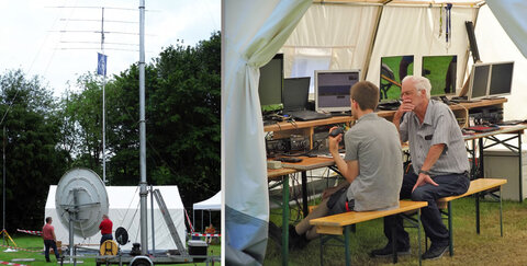 Sogar Full-HD-Fernsehübertragungen sind damit möglich – über einen neuen Amateurfunk-Satelliten, der ganz Europa und den Nahen Osten mit seinen Signalen versorgt. Am Himmelfahrts-Wochenende hatte „die Schüssel“ ihren ersten Einsatz: beim traditionsreichen Field Day auf der Wiese hinter Haus Rott an der Spicher Autobahn-Abfahrt.