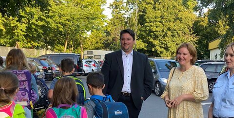 Die Sicherung der Schulwege und ihr Ausbau ist seit vielen Jahren ein Schwerpunkt der Troisdorfer Verkehrspolitik. „Schulwege sind mit täglichen Gefahren für unsere Kinder im Straßenverkehr verbunden. Wir müssen alle - Eltern, Lehrer, Polizei und Stadtverwaltung - gemeinsam versuchen, diese Gefahren so weit wie möglich zu vermeiden und die Schulwege noch sicherer zu machen“, betonte Bürgermeister Alexander Biber heute bei einem Pressetermin zum Schulstart an der Sternenschule in Spich. Dort werden in diesem Jahr 84 Schulneulinge eingeschult. Biber weiter: „Das Bringen der Kinder mit dem Auto führt zu deutlich höheren Gefährdungslagen. Wenn eben möglich, sollten die Eltern ihre Kinder zu Fuß zur Schule bringen. Wenn das nicht vermeidbar ist, sollten die Eltern die eingerichteten "Anbringzonen" nutzen.