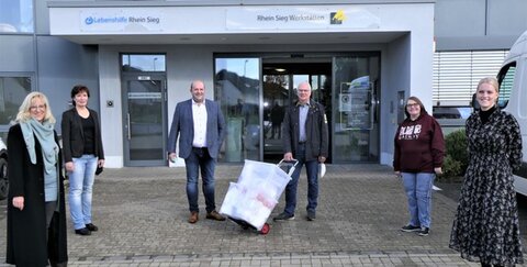 Der Geschäftsführer der Rhein-Sieg-Werkstätten der Lebenshilfe Rhein-Sieg in Troisdorf-Rotter See, Markus Wilden, freute sich ganz besonders über eine großzügige Spende. Heike Jeremies und Johannes Wiesberg vom Troisdorfer Verein F.i.T. Box e.V. überreichten der Einrichtung tausend Mund-Nasen-Masken.