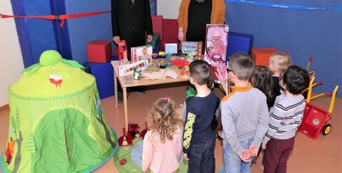 Ortsvorsteher Rudolf Eich aus Troisdorf-West überbrachte in zwei städtischen Kindertagesstätten überraschende Sachspenden.