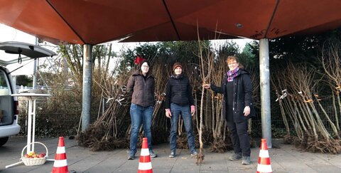 Die neuen Baumbesitzer erhielten die Bäume ihrer Wahl von Suzanne Schwirian, Angela Gerok und Martina Neuer, Mitarbeiterinnen des Amts für Umwelt- und Klimaschutz. Insgesamt fanden 80 Mirabellen, Birnen, Zwetschen, Kirschen und Apfelbäume neue Besitzer. Dabei waren Apfelsorten wie Rheinisches Seidenhemdchen, Danziger Kantapfel, Jacob Lebel, Rheinischer Winterrambur, Goldparmänedie, die Birnensorten Clapps Liebling, Alexander Lucas, Köstliche aus Charneux und Kirschsorten Burlat, Oktavia und Büttners rote Kirsche aber auch Hauszwetschen und Mirabelle,