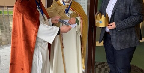 Damit die Tür zum Troisdorfer Rathaus auch in diesem Jahr von einem Segenstreifen verziert werden konnte, brachten die beiden Pastoralreferenten der Pfarreiengemeinschaft Troisdorf und der Pfarrei St. Johannes Troisdorf diesen kurzerhand selbst vorbei. Zur Überraschung von Bürgermeister Alexander Biber kamen Joachim Bourauel und Friedhelm Hohenhorst bei ihrem Rathausbesuch in den traditionellen Dreikönigsgewändern. Dem Bürgermeister überbrachten sie den Segen und klebten den Segenstreifen über die Rathaustür. Außerdem überreichten sie eine von Kindern selbst gebastelte Krone. Alexander Biber händigte seinen Gästen im Gegenzug eine Spende für jeden der 12 Stadtteile aus und überreichte ihnen auch seinen aktuellen Karnevalsorden. Joachim Bourauel und Friedhelm Hohenhorst berichteten dem Bürgermeister, dass Troisdorfer Haushalte trotz Corona nicht auf die Dreikönigssegenstreifen verzichten müssen. Die Segenstreifen wurden dort, wo es gewünscht war, in die Briefkästen gelegt mit der schriftlichen Bitte um eine Spende an das Kindermissionswerk. Wer einen Segenstreifen für seine Haustür möchte, kann sich ans Pastoralbüro der Pfarreiengemeinschaft wenden (Tel. 02241/76186).