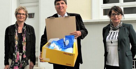 Große Freude vor dem Sozialpsychiatrischen Zentrum der Diakonie an Sieg und Rhein (SPZ) in Troisdorf: Volker Herdick, Geschäftsführer der Troisdorfer Firma HMPG, übergab 550 Mund-Nasen-Masken und Desinfektionsmittel als Spenden.