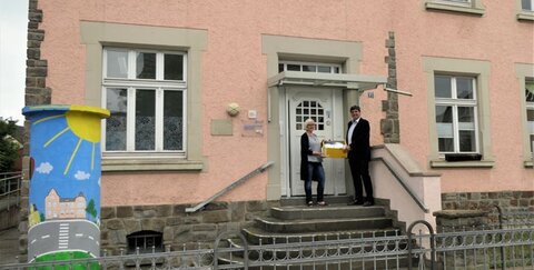 Kita-Leiterin Stefanie Kirsten nahm den Karton mit der Spende entgegen und leitete die Mund-Nasen-Masken auch an andere städtische Kitas weiter. Sie freute sich über die Unterstützung der Einrichtungen, die sich um den Schutz der Gesundheit von Kindern, Eltern und Mitarbeiterinnen und Mitarbeitern kümmern.