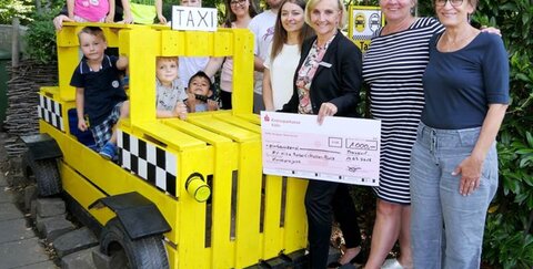 Andrea Jung aus der Sparkassen-Filiale in der Roncallistraße überreichte die Spende und wünschte der Kita-Leiterin Eike Schulz, den neun Erzieherinnen und dem Förderverein weiterhin viel Freude an der künstlerischen Gestaltung in der Kita zusammen mit den 70 Kindern. Die Scheckübergabe fand in einem Taxi statt, genauer in einem aus Holz und Reifen gestalteten Spiel-Taxi für die Kinder, das Inklusionshelfer Robert Rotarius einst mit den Kindern gebaut hatte.