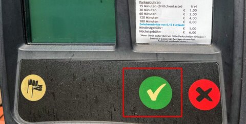 Die grüne Taste mit dem Häkchen auf den Parkscheinautomaten dient als Brötchentaste.