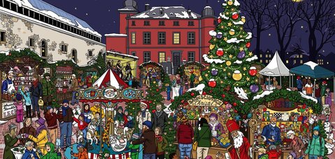 - Illustration des Weihnachtsmarktes von Juliane und Matthias Zimmer aus dem Wimmelbuch