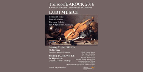 TroisdorfBAROCK, das sommerliche Festival mit Barocker Kammermusik in Troisdorf, findet 2016 zum achten Mal unter der künstlerischen Leitung von Kantor Michael Veltman statt, veranstaltet von der Katholischen Pfarreiengemeinschaft Troisdorf. In diesem Jahr ist das Festival den beiden frühbarocken Komponisten Heinrich Schütz und Samuel Scheidt, sowie ihren Lehrern Giovanni Gabrieli und Jan Pieterszoon Sweelinck gewidmet.