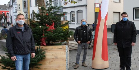 v. l.: Ralf Brozeit von den Stadtwerken Troisdorf, Veranstaltungsorganisator Jürgen Kutter und Bürgermeister Alexander Biber an einem der vorweihnachtlichen Dekopunkte in der Fußgängerzone am Fischerplatz.