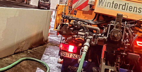 Die Rufbereitschaft wird aktiviert, noch bevor Glätte entstanden ist. Die Mitarbeiter*innen sind in der Regel innerhalb von 30 Minuten einsatzbereit. Das Beladen der Fahrzeuge erfolgt schnell und effizient über Silo oder mit einem Radlader. Bei zu erwartendem Schneefall werden die Schneeschilder im Vorfeld an die LKWs montiert.