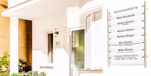 Rechtsanwälte: Marlies Ziemer, Markus Hüsges, Max Ziemer (zugleich Fachanwalt für Strafrecht und Fachanwalt für Miet- und Wohnungseigentumsrecht), Mirka Ziemer(zugleich Fachanwältin für Familienrecht), Dr. Monika Everschor* (zugleich Fachanwältin für Verkehrsrecht).