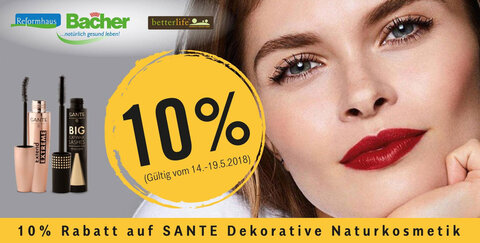 SANTE Naturkosmetik ist 100% zertifizierte Pflege für natürliche Haut - 10% Rabatt auf alle dekorativen Kosmetikartikel der Firma SANTE erhaltet ihr von Mo.-Sa., 14.-19.5.2018 im Reformhaus Bacher.
