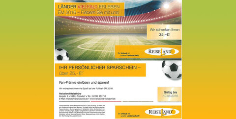 Anlässlich der Fußball-EM bietet euch das Reiseland einen besonderen Sparschein im Wert von 25 Euro, den ihr für Reisebuchungen ab einem Wert von 500 Euro nutzen könnt!