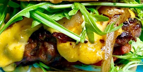 Rindfleisch-Chorizo Patty / Cheddar / Zwiebeln / Rucola 13,90