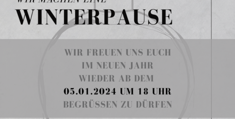 Wir freuen uns Euch ab dem 05.01.2024 um 18Uhr wieder begrüßen zu durfen!
