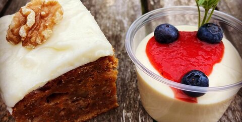 Kartoffelsamtsuppe mit Bärlauchöl, Kalbsrückensteak mit Kräuterkrüste oder Lammkarree mit Ratatouille, grünem Spargel und Kartoffelgratin und Julians Carrot Cake & Eierlikörmousse.