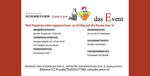 Das Restaurant Schneider junior bietet auch in diesem Jahr viel an den Karnevalstagen!