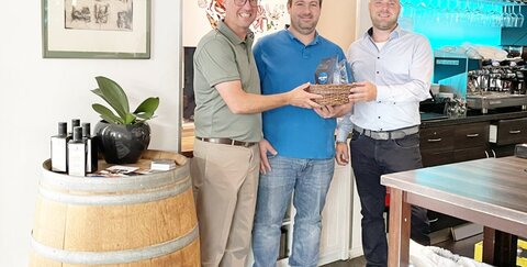 Willkommenspräsent von der TROWISTA für Cristoforo Nicosia. Von links: Stephan Frings (TROWISTA Zentrenmanager), Cristoforo Nikosia (Quattro Passi, Caffeé del Arte) und Tobias Voits (TROWISTA Wirtschaftsförderer)