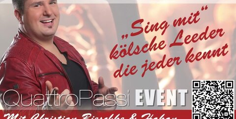 Christian Bieschke – Seit über 10 Jahren stehe ich, Christian Bieschke, auf den Brettern, „die die Welt bedeuten“. Anfangs als Solist mit sämtlichen Coversongs aus sämtlichen Musik Genren. Schon als kleiner Junge liebte ich die Musik und vor allem den Gesang. 2006 entdeckte ich den modernen Pop-Schlager für mich und fing an, mehr und mehr Songs aus dem Genre zu singen. Dabei habe ich jedoch Lieder meiner „Muttersprache“ – Kölsch – nie vernachlässigt. Ticket Mitsingabend: 55,00 € pro Person inkl. 3-Gänge-Menü, exkl. Getränke