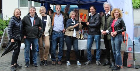 Informationsstand so wie Aktions- und Infomaterial lagen bereit am Fischerplatz, eine Tombola war vorbereitet: Und dann schüttete es vom Himmel. Zwar konnten einige Lose verkauft werden, aber die Auktion für den vom bekannte Troisdorfer Künstler Giovanni Vetere für Rotary bemalte Papphocker, der zugunsten von PolioPlus versteigert werden sollte, konnte nicht stattfinden.