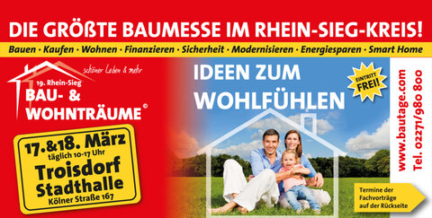 Ob Immobilienbesitzer, Häuslebauer oder Mieter - die „Bau-& Wohnträume“ in Troisdorf bietet am 17. und 18. März ein Wochenende voller Informationen rund ums Bauen und Wohnen.