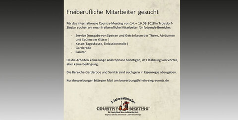 In der Küz in Troisdorf Sieglar findet im September 2018 das 3. Internationale Country Meeting statt. Für folgende Bereiche werden noch freiberufliche Mitarbeiter gesucht: