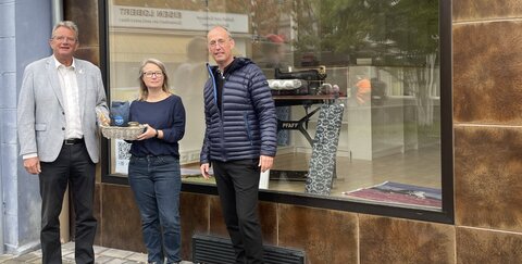 „Das wird ein richtig schmucker Laden und passt sehr gut in die Troisdorfer Innenstadt“, freut sich Wolf-Dieter Grönwoldt, Geschäftsführer bei der Troisdorfer Wirtschaftsförderungs- und Stadtmarketing GmbH (TROWISTA) während der Übergabe des Willkommenspakets an Dana Pauli, Inhaberin des Stoffladens „SanDaLu“ vor dem Ladenlokal „An der Feuerwache 1“. Dana Pauli übernimmt das Ladenlokal von Daniel Helm, der sich nach vorübergehender Anmietung nun mit seinen hochwertigen Wohn- und Einrichtungsartikeln weiter auf sein Kerngeschäft im Camp Spich konzentrieren wird.