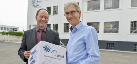 ... dem Unternehmer Wolfgang Schmitz-Mertens, Geschäftsführender Gesellschafter unseres langjährigen Mitgliedsunternehmens Schmitz-Mertens & Co. KG – Kaffeerösterei zum 160. Unternehmens-Jubiläum:„Schmitz-Mertens zählt zu den großen Unternehmer-Namen in Troisdorf und reiht sich ein in Namen wie Reifenhäuser oder Mannstaedt. Nicht umsonst ist dieser nun in der fünften Generation aktiven Unternehmer-Familie nun auch ein Straßenname in Troisdorf gewidmet. Die denkmalgeschützte Kaffeerösterei firmiert nun nicht mehr in der Boschstraße, sondern in der Schmitz-Mertens-Straße 1 im Ortsteil Spich. Ehre, wem Ehre gebührt!