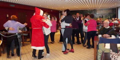 Eine tolle Überraschung erwartete die Teilnehmerinnen und Teilnehmer des letzten Senioren-Tanzcafès in diesem Jahr. Die Familie Banischewski hatte den Weihnachtsmann bestellt und der hatte tatsächlich den Weg ins Oberlarer Schützenhaus gefunden. In seiner kurzen Ansprache lobte er die vielen Tänzerinnen und Tänzer, die mit großer Freude an den regelmäßigen Terminen im Laufe des Jahres teilgenommen hatten. Sie würden damit viel Gutes für ihre Gesundheit tun.