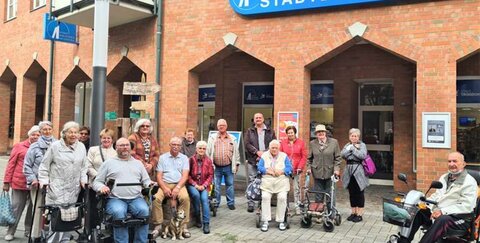 Und sie waren überrascht über die große Resonanz bei Seniorinnen und Senioren: 18 Teilnehmerinnen und Teilnehmer machten sich ab Stadtbibliothek in der Fußgängerzone auf den Weg, um Straßenbelag, Treppen und Plätze zu inspizieren.